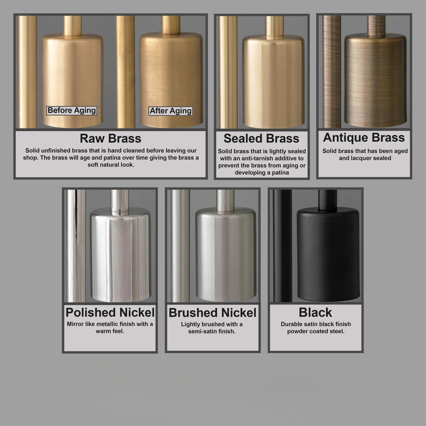 - Sealed Brass - Solid brass that is lightly sealed with an anti-tarnish additive to prevent the brass from aging or developing a patina.