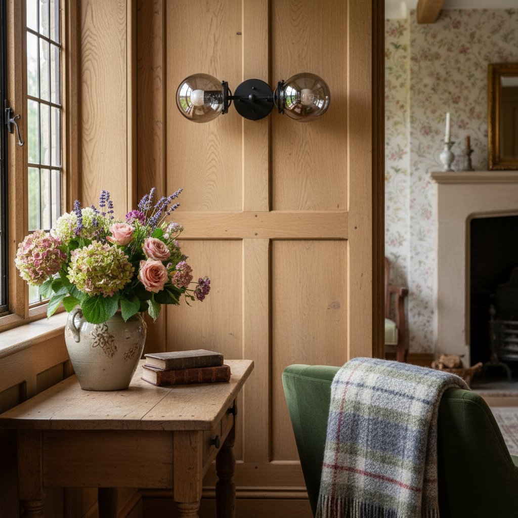 Lumio Globe Double Globe Vanity Wall Light - Rustic Farmhouse Bathroom Wall Fixture - Antique Brass / 18" / 45.7 cm / Smoked Glass