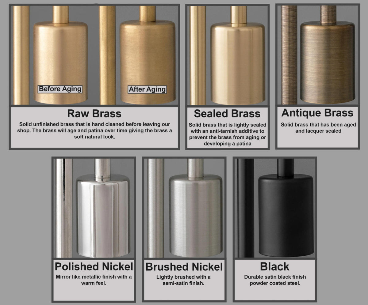 - Raw Brass - features solid unfinished brass that is hand cleaned before leaving our shop. The brass will age and patina over time giving the finish a soft natural look