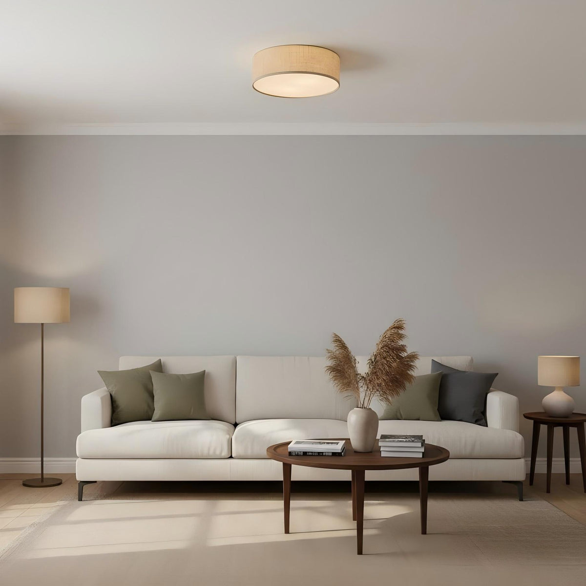 Dumora Linen Drum Flush Mount Ceiling Lamp - Stylish Soft Fabric Ceiling Light - 12″ / 30.5 cm / White