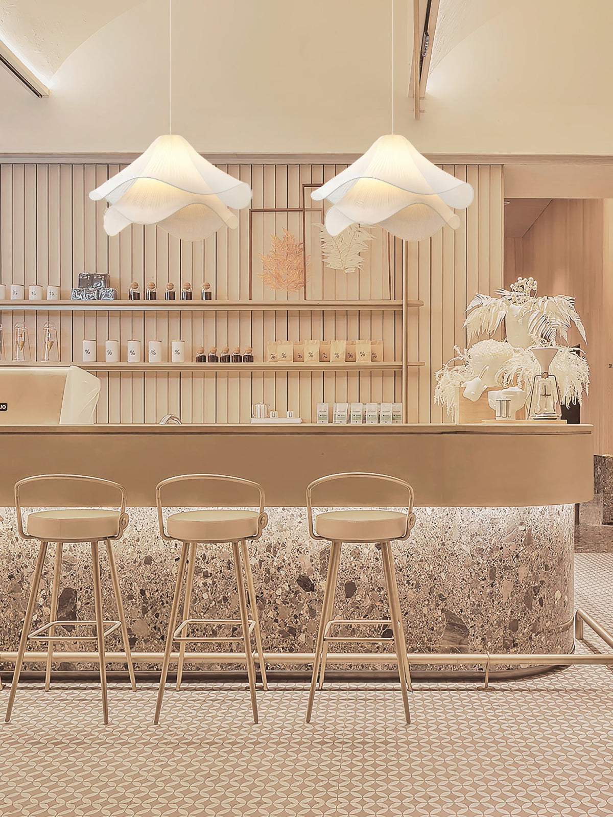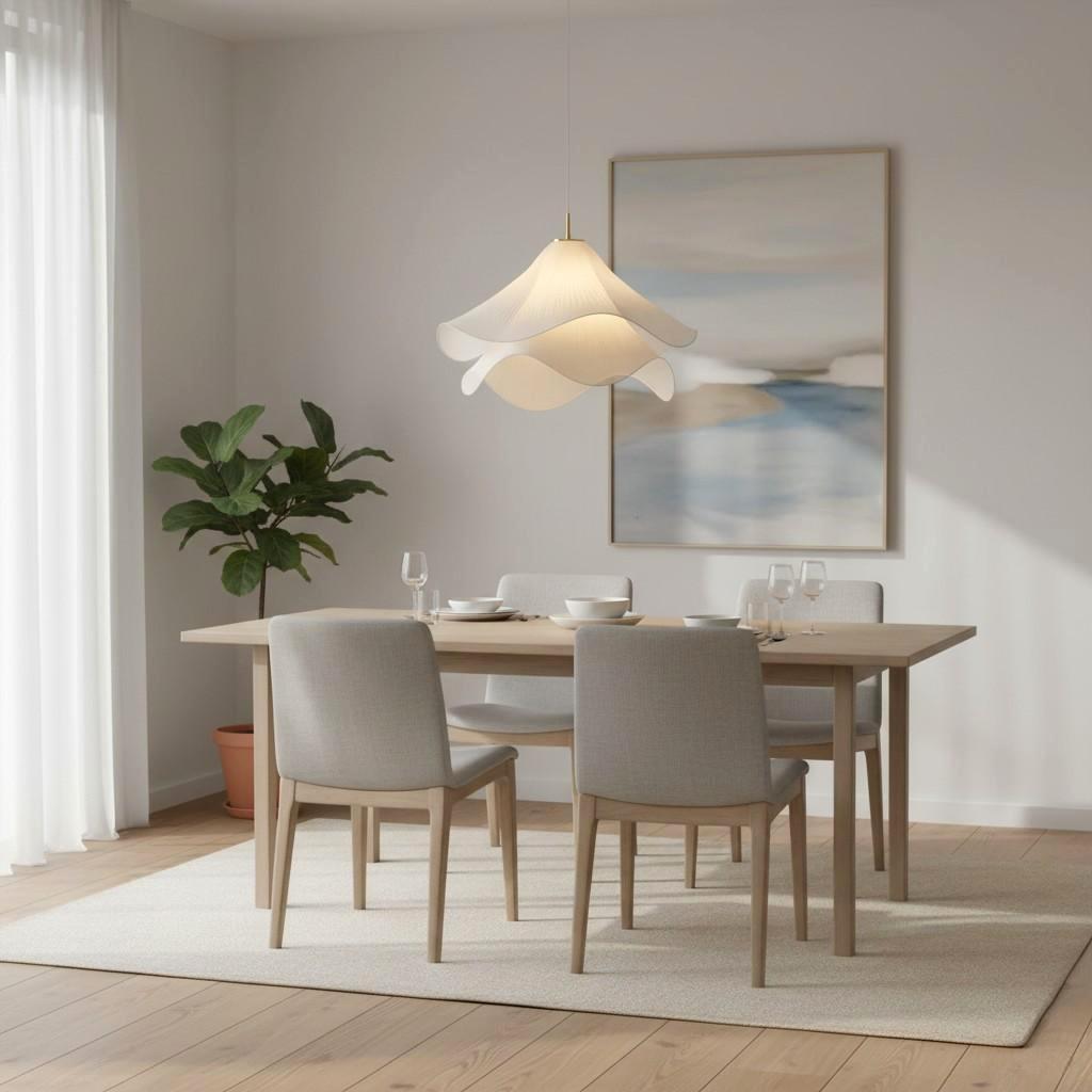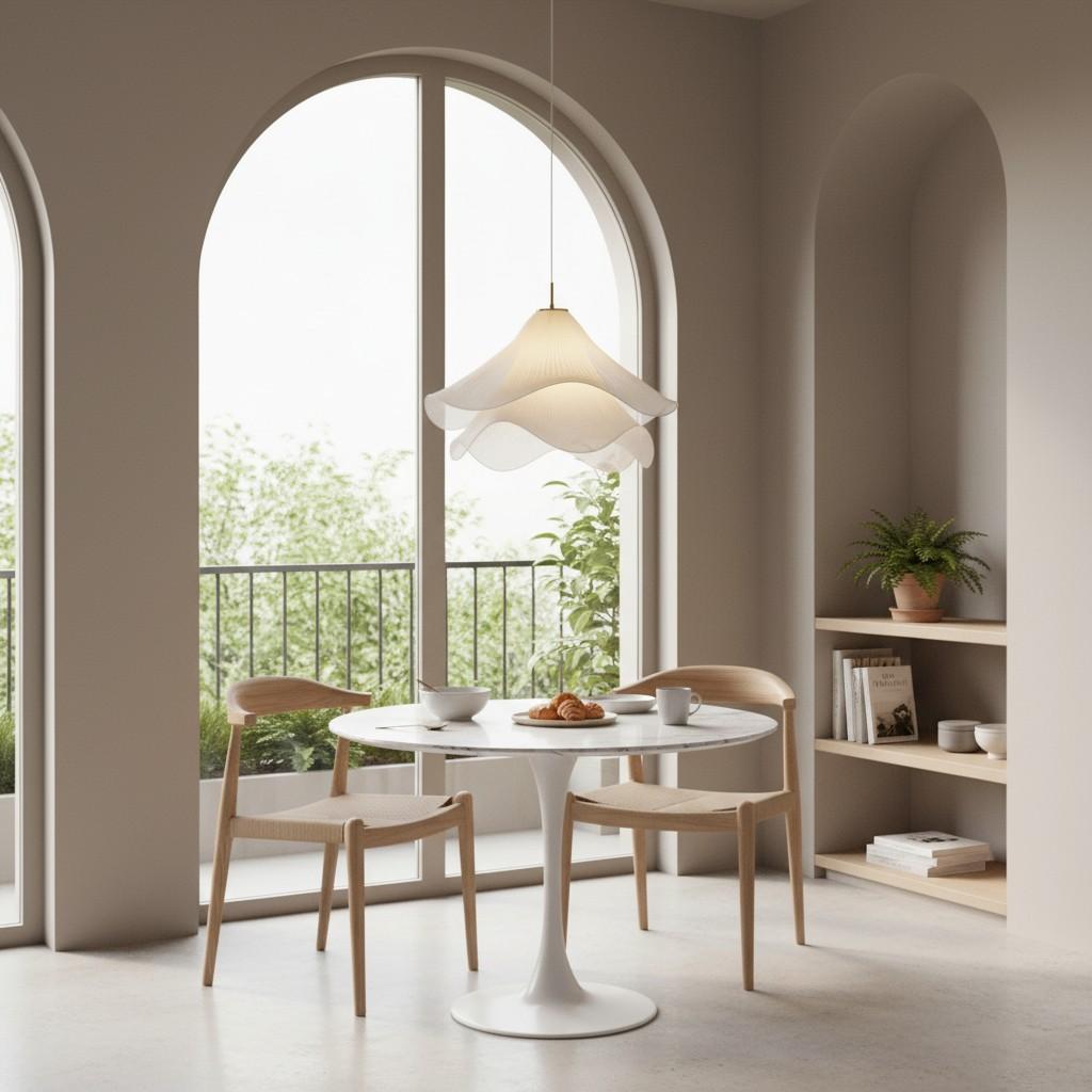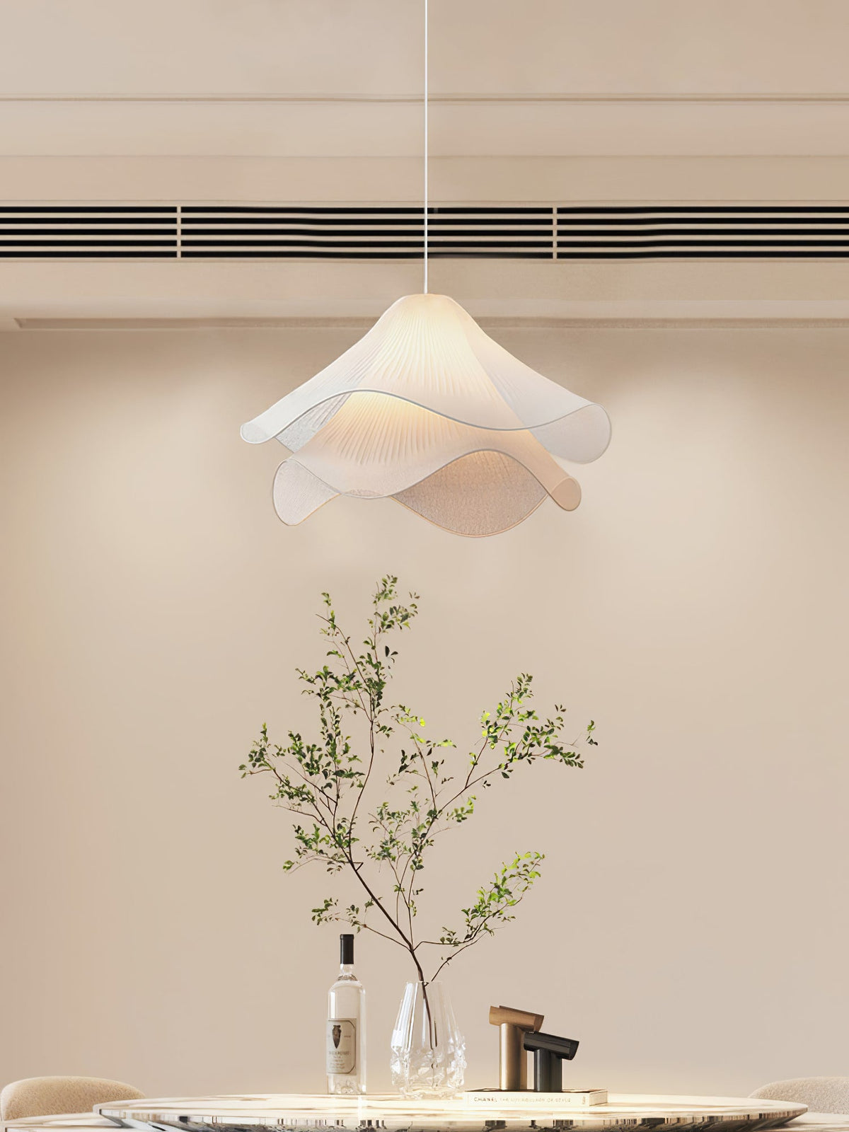 Ethereal Pleated Fabric Bloom Pendant Lamp - French Floral Design Fixture - ∅ 30cm x H 25cm / Gold & White