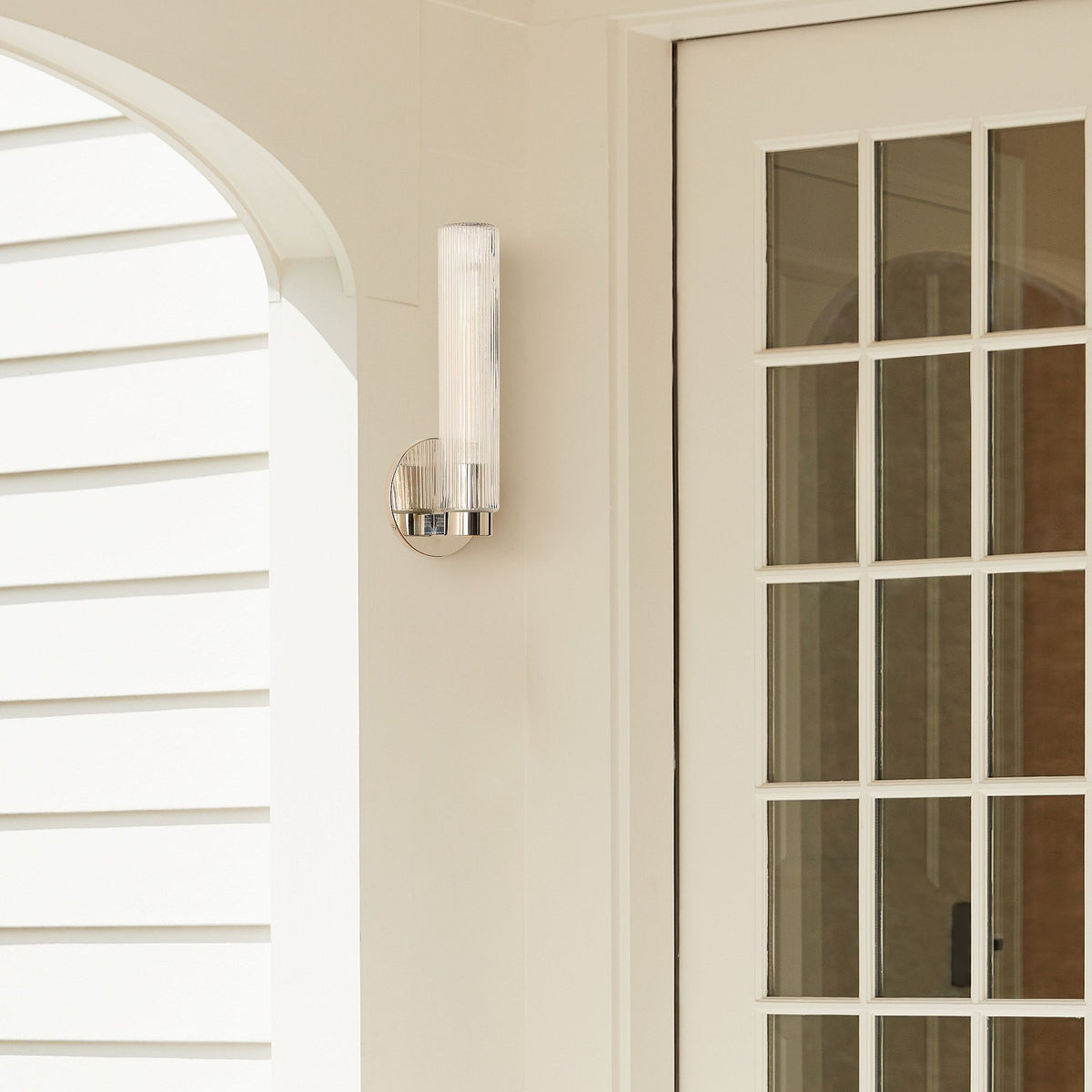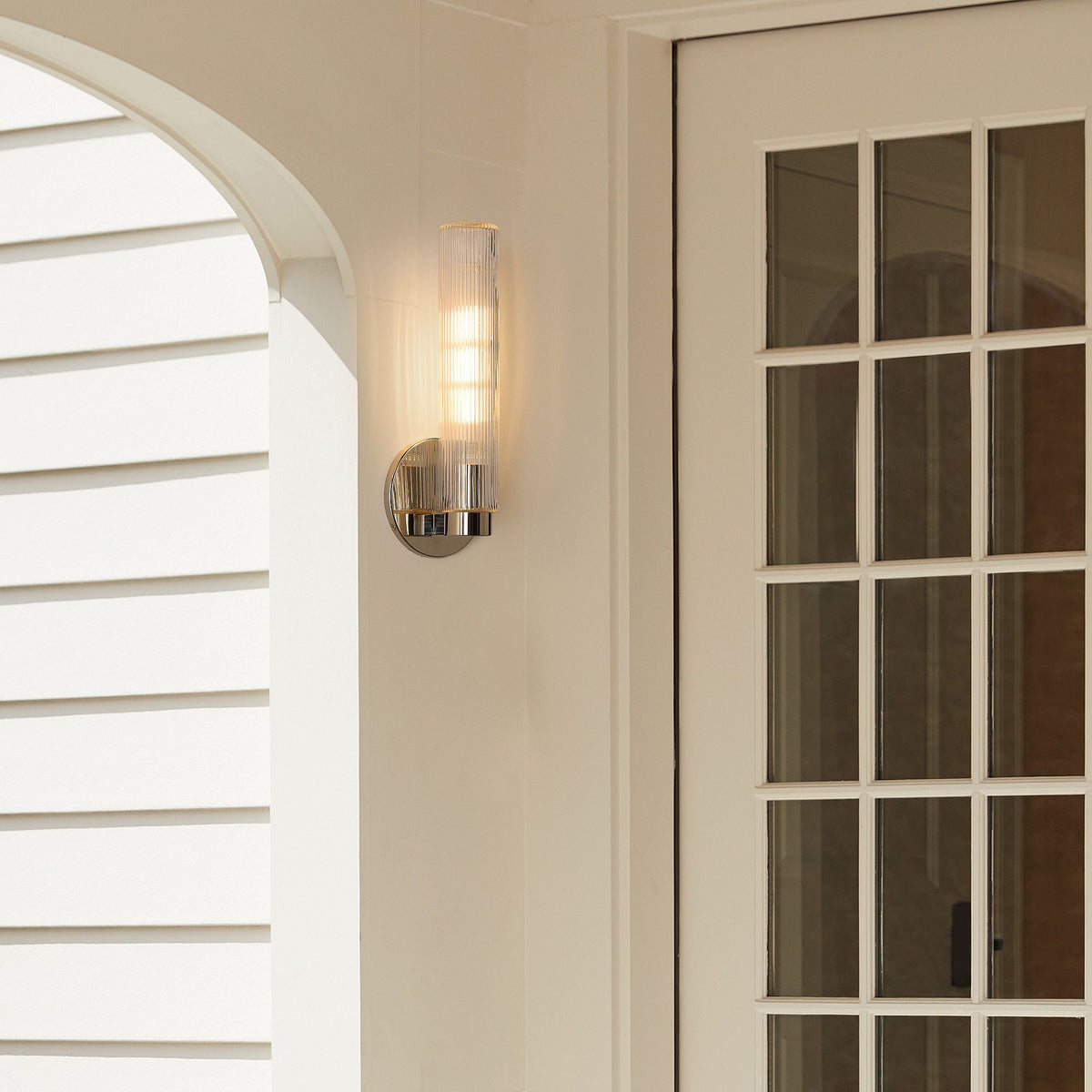 Rivora Fluted Glass Indoor Outdoor Sconce - Modern Wall Light for Home Decor - Clear Glass / Antique Brass / ∅ 6″ x H 16″ / Dia 15.2 cm x H 40.6 cm